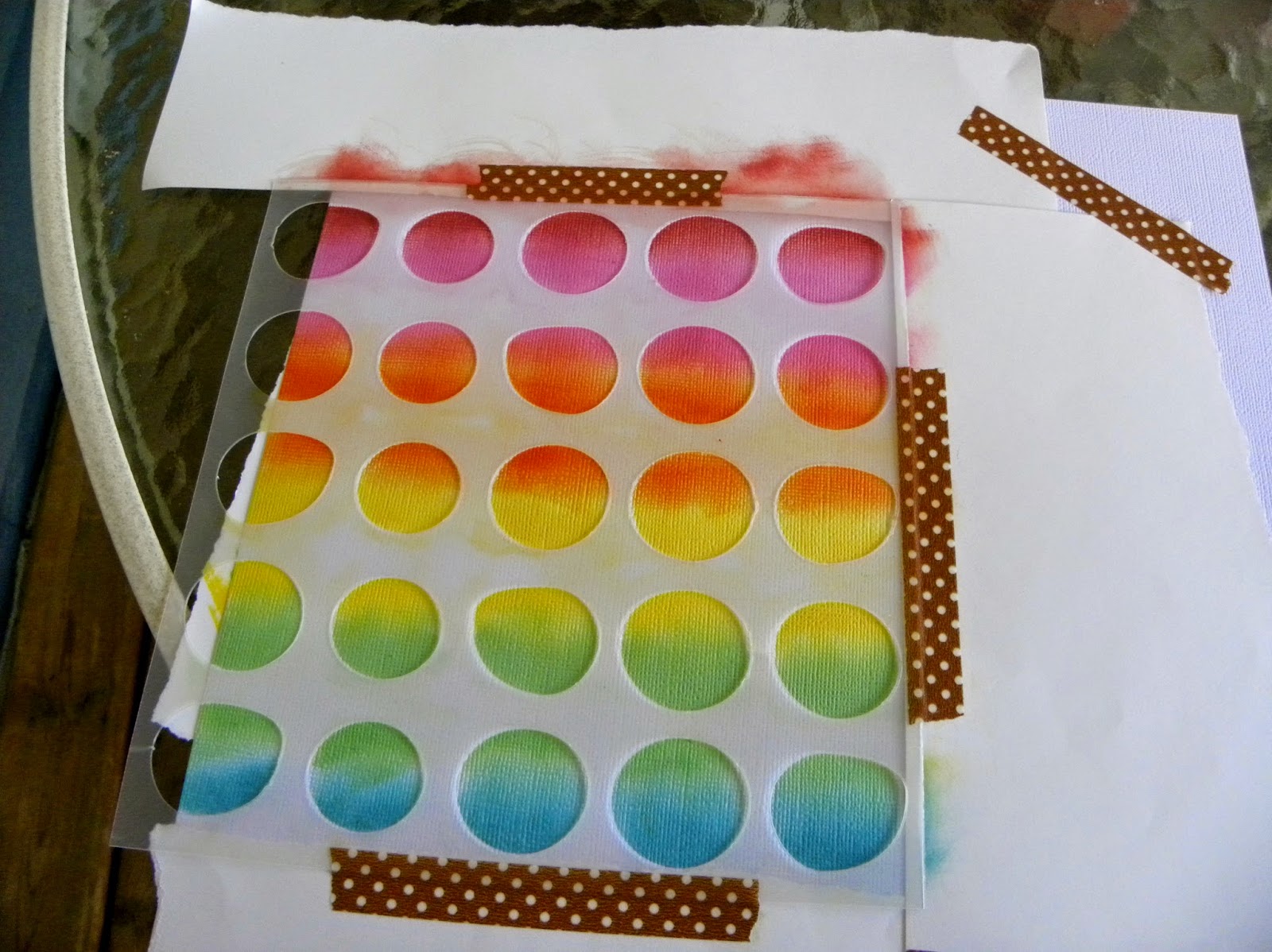 Step 5: I wanted to make a rainbow effect so I selected my colours of Distress Ink. I started at the top with the red and used my foam applicator to rub it half way into first row of circles in the stencil.