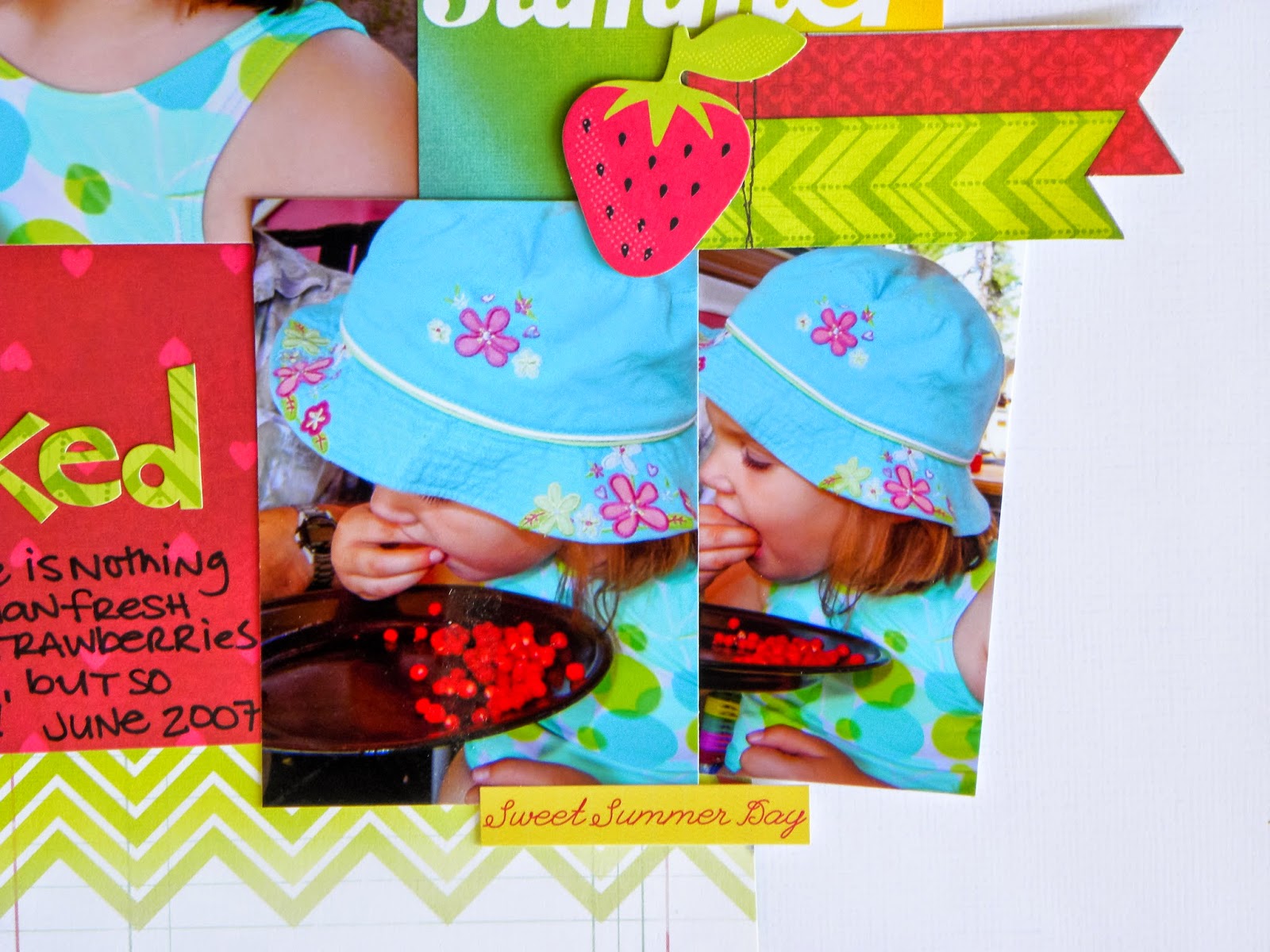 I loved all the fun strawberries in the kit and I knew right away that they would be perfect to use on this layout of my daughter eating her freshly picked wild strawberries.